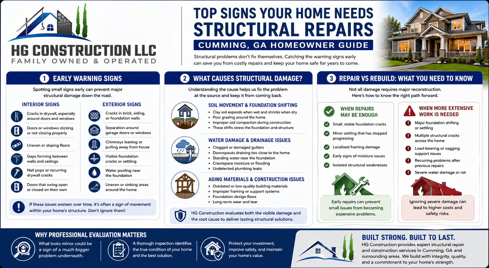 HG Construction provides structural repair and foundation repair services in Cumming, GA, helping homeowners determine whether these issues are cosmetic or signs of serious structural damage.